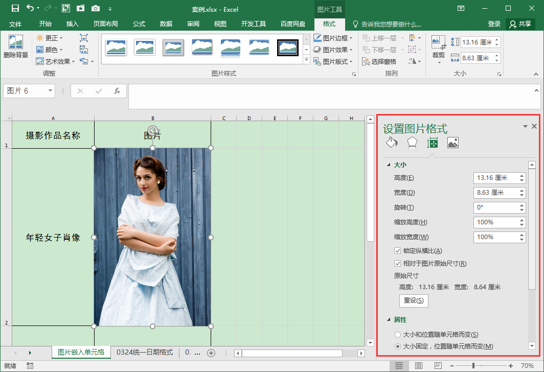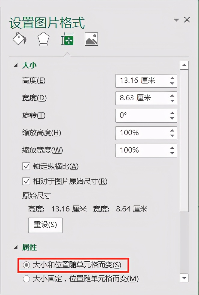 4. 在“设置图片格式”窗格中选择“属性”下面的“大小和位置随单元格而变”。