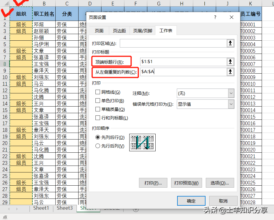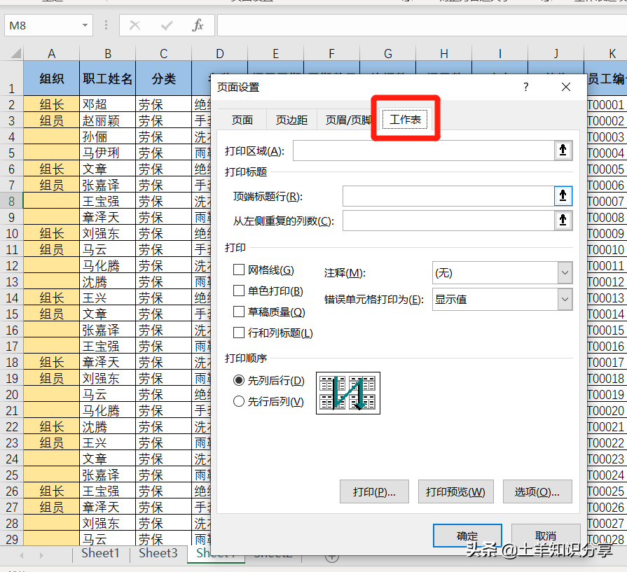 在对话窗口选中【工作表】