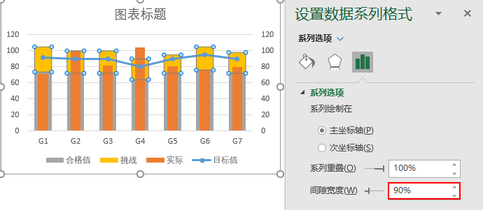 Step-03:选择“实际值”系列, 打开【设置数据系列格式】窗格,将【间隙宽度】设置为90%。如下图所示: