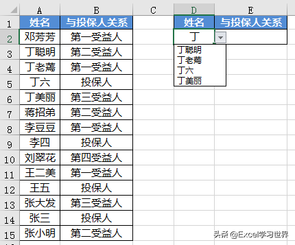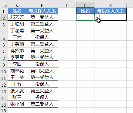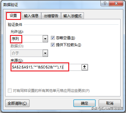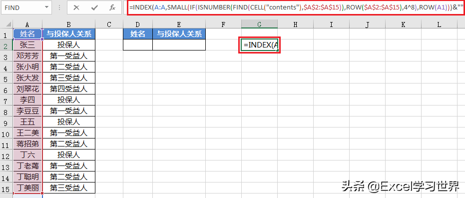 - 来源:=OFFSET($A$2,MATCH("*"&$D$2&"*",$A$2:$A$14,0)-1,0,COUNTIFS($A$2:$A$15,"*"&$D$2&"*"),1)