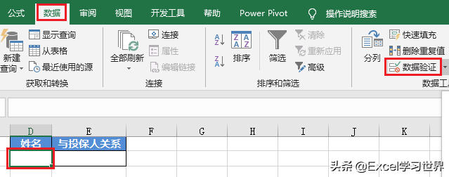 3. 选中 D2 单元格 --> 选择菜单栏的“数据”-->“数据验证”