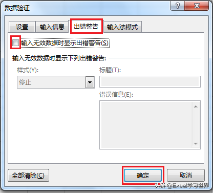 5. 选择“出错警告”选项卡 --> 取消勾选“输入无效数据时显示出错警告”--> 点击“确定”