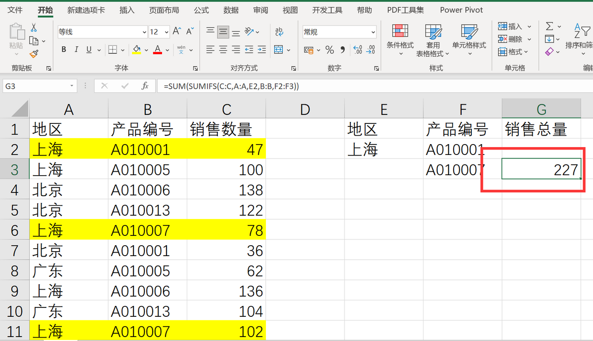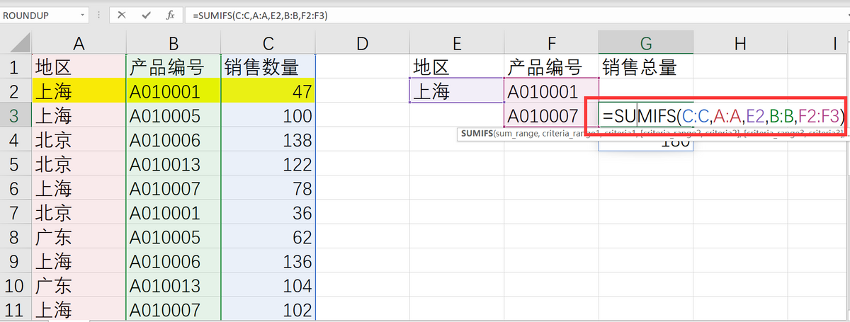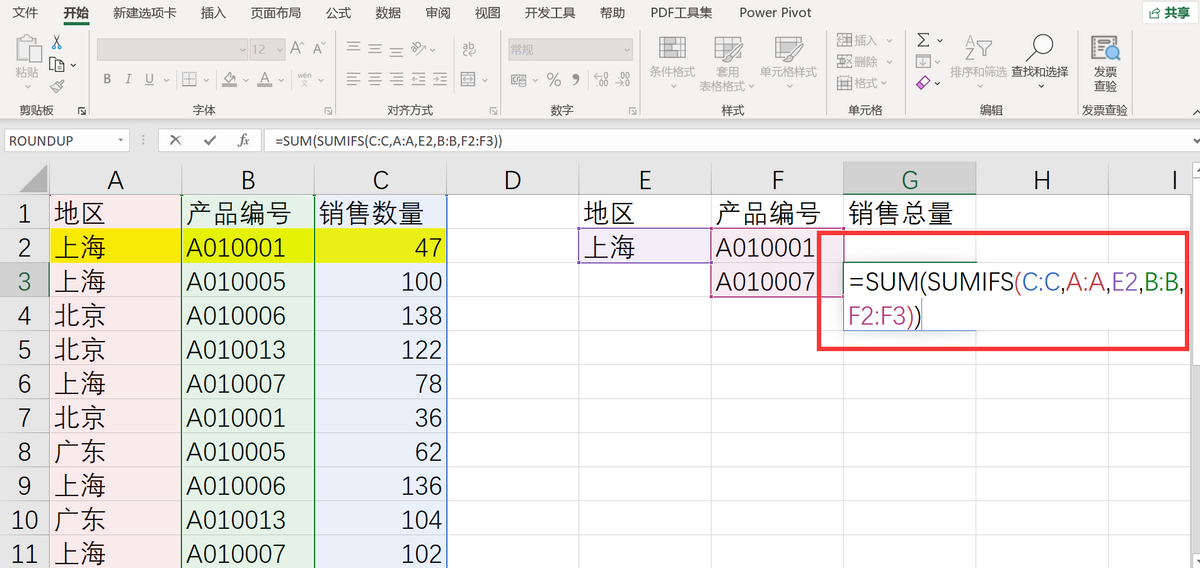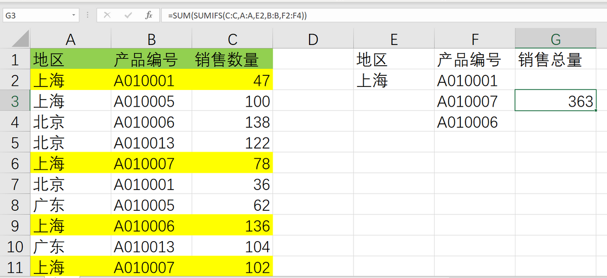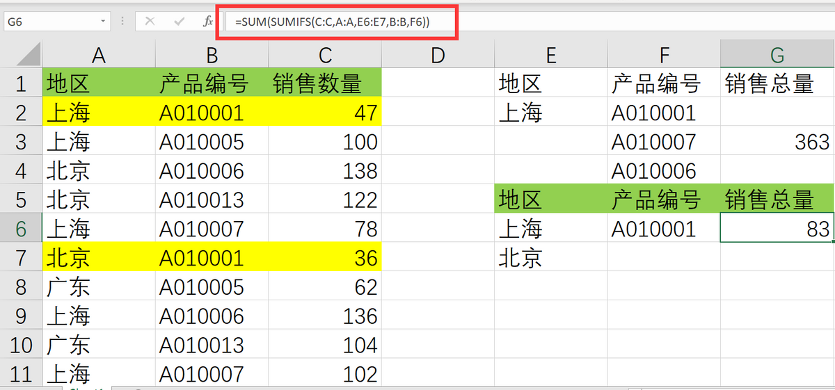 同理如果需要统计上海和北京两个地区编号为A010001产品的销售总量,也只需要简单的“=SUM(SUMIFS(C:C,A:A,E6:E7,B:B,F6)) ”公式就搞定了。