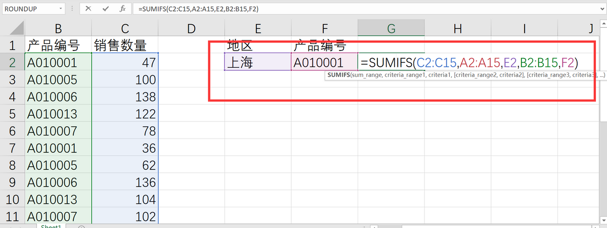 分析:这里有两个条件,一个是地区一个是产品编号,故使用SUMIFS函数,完整函数公式:“SUMIFS(C2:C15,A2:A15,E2,B2:B15,F2)”。