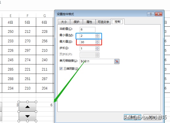 (3)鼠标右键第一个数值调节钮→设置控件格式→最小值设为2→最大值设为30→单元格链接选择G11单元格。
