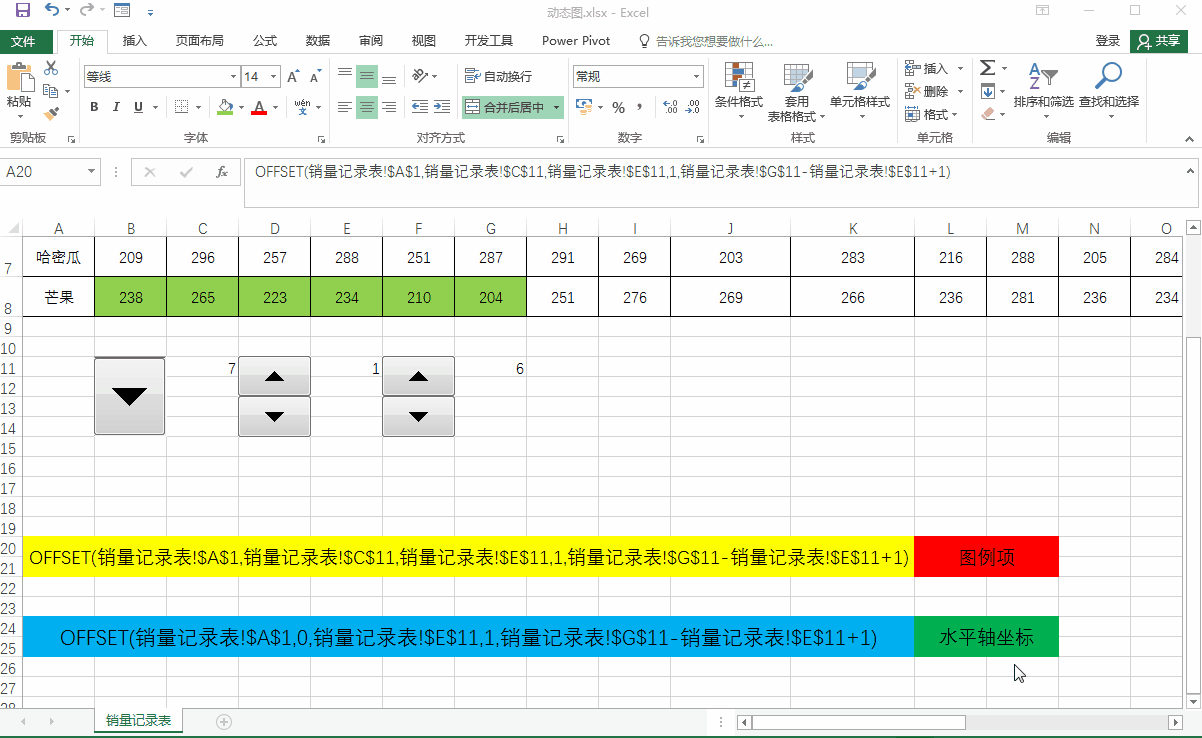 3.第一个名称“图例项”使用三个控件链接的单元格返回的数值作为OFFSET函数的参数,引用的单元格区域是要添加在动态折线图上的销量数据。