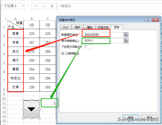 (1)鼠标右键组合框→设置控件格式→数据源区域选择所有的水果品种→单元格链接选择C11单元格→下拉显示项数设置为7(水果种类共七种)。