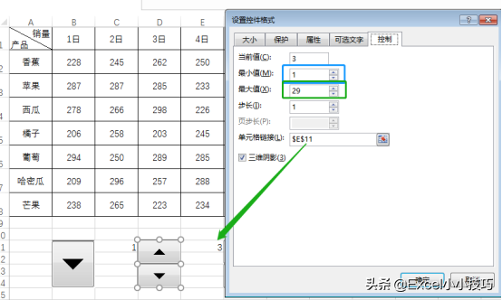(2)鼠标右键第一个数值调节钮→设置控件格式→最小值设为1→最大值设为29→单元格链接选择E11单元格。