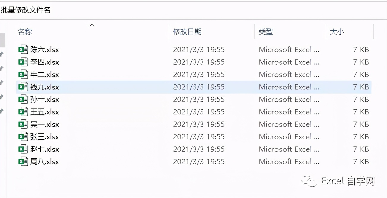 比如说,我们简单举个例子,下面的文件夹里面有十个文件(实际处理会更多,根据您的需求,随便多少都可以)。我要将这十个以人名命名的文件夹,批量修改为“原有的人名”+“成绩” 二字。
