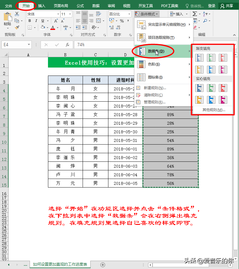 我们想让“拍摄进度”看得更加直观,在菜单中选择“开始”在功能区中选择并点击“条件格式”,在下拉列表中选择“数据条”会在右侧弹出填充规则。在填充规则里选择自己喜欢的样式即可;如图所示: