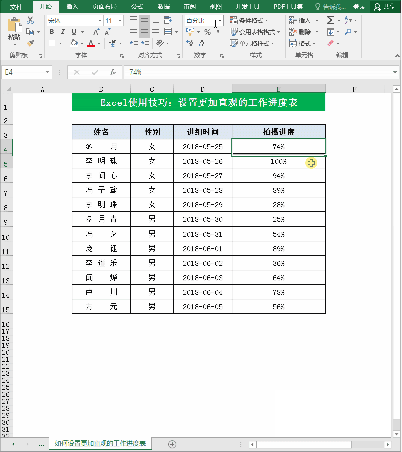 首先,打开一张Excel工作完成进度表,看到“拍摄进度”列的数据;如图所示: