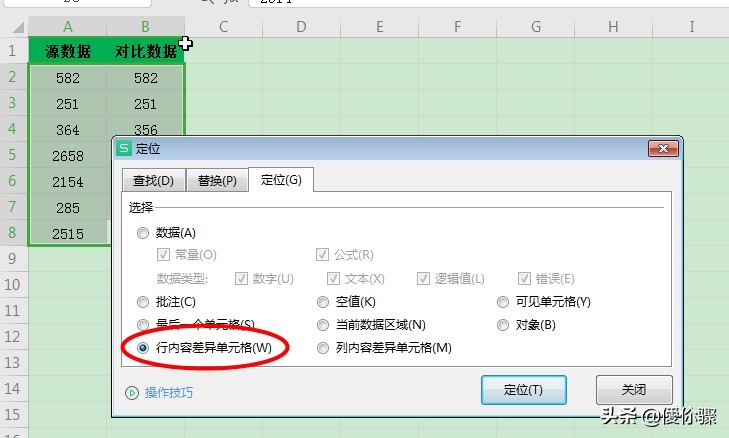 在弹出的“定位”界面中,选择“行内容差异单元(W)”,点击“定位”即可;如图所示: