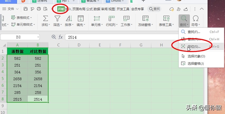 选中要对比的两个数据“单元格”列,选择并点击菜单栏中的“开始”→“查找”→“定位”即可;如图所示: