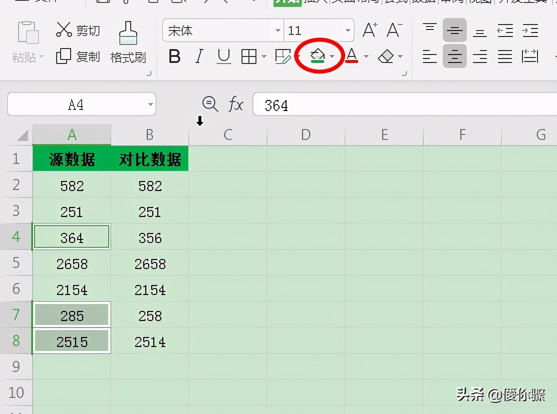给对比出来的数据填充一种颜色,选择菜单栏中的“开始”→“填充颜色”即可;如图所示: