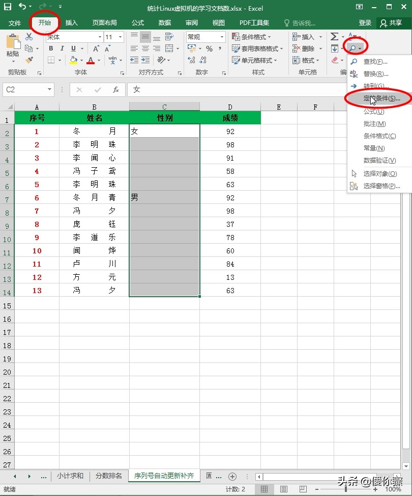 在菜单栏中选择“开始”,在功能区中选择“编辑”内地“查找和选择”点击下拉三角形,在弹出的下拉框中选择并点击“定位条件”即可,(注:或是用Ctrl + G直接打开“定位”的对话框,在界面中选择“定位条件”点击;小编建议初学者还是要熟悉Excel界面的,尽量使用界面操作,熟悉了之后大家再去记住Excel的快捷,更容易理解。)如图所示: