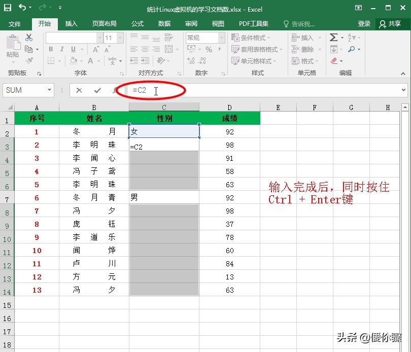 在编辑栏中输入“=C2”,输入完成后在键盘中同时按住Ctrl + Enter键即可;如图所示: