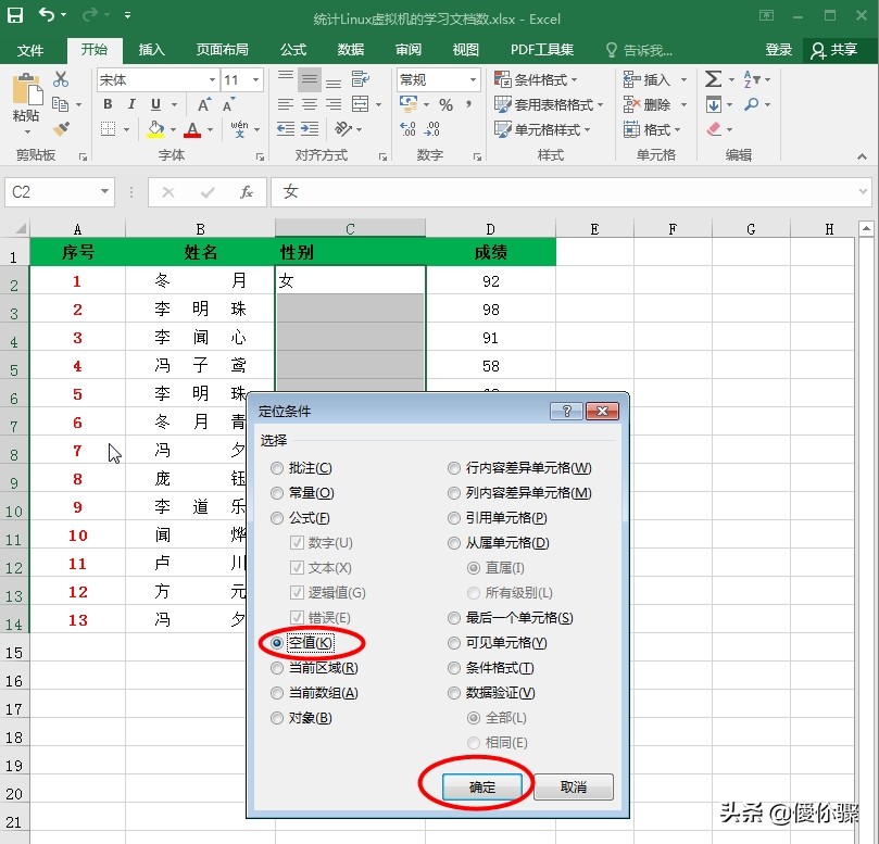 在弹出“定位条件”的界面中,选择“空值”点击“确定”即可;如图所示: