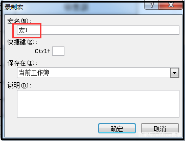 2、在打开的【录制宏】对话框里,给宏命名,本例中,我们就命名为“宏1”,因此在【宏名】输入框里输入“宏1”,然后点击【确定】。