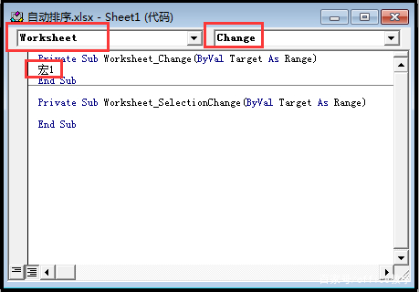 1、右键工作表名称—【查看代码】,在弹出的vba窗口里,在左侧的下拉框里选择【worksheet】,在右侧的下拉框里选择【Change】,然后在自动生成的代码中间插入一行,输入前面命名的宏名称,即“宏1”。