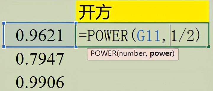 1.在第一列输入我们的需要开平方的数据,在第二列输入=POWER(G11,1/2),G11代表你需要进行开方的单元格数据,1/2代表是开平方。当然你也可以开1/3,或者其他,都可以。