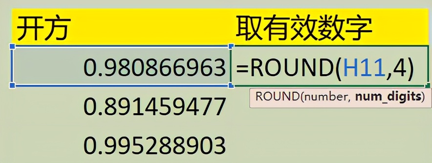 3.然后我们在第三列,进行取四位有效数字,使用=ROUND(H11,4)*,H11是需要设置的单元格,4为四位有效数字。