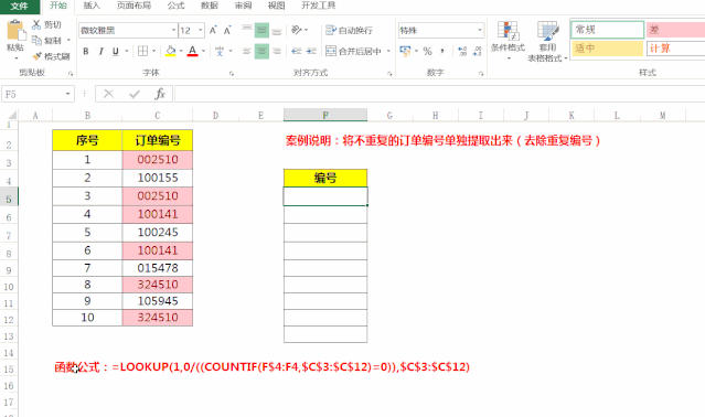 我们通过lookup&countif函数嵌套的方式,这样就能够快速的将有重复的编号,单独提取出来不重复的值。