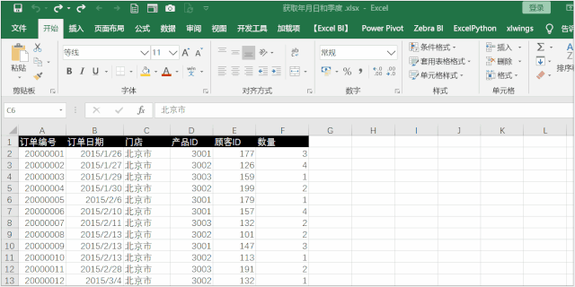 下面,我们来看这样一个问题:现有一张销售数据表,其中有一个订单日期字段,由于我们想要查看每个月、每个季度的销售情况,所以还需要将订单日期中的月份和季度等信息单独提取出来作为一列。