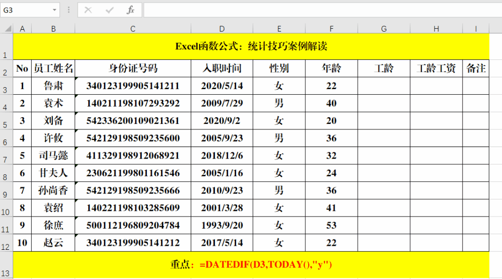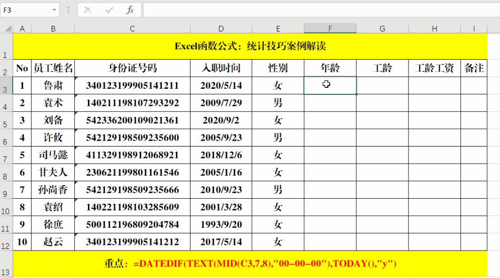 在目标单元格中输入公式:=DATEDIF(TEXT(MID(C3,7,8),"00-00-00"),TODAY(),"Y")。
