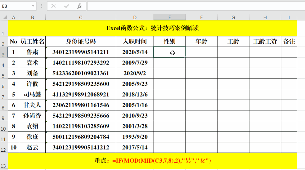 在目标单元格中输入公式:=IF(MOD(MID(C3,17,1),2),"男","女")。