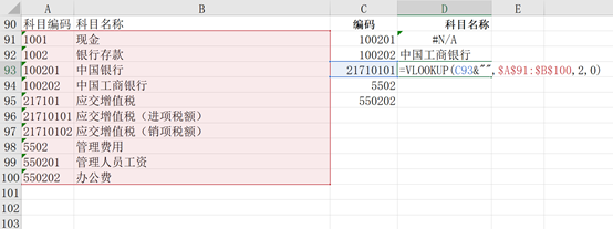 我们看到上图中C列中要查找的数据类型是数值型,而查找区域中A列的数据为文本型,虽然值相同但数据类型不同,所以D91单元格中用vlookup直接查找C91是找不到的,而D93单元格中查找时将要查找的值换成C93&””(转换成文本型数据)就可以了!