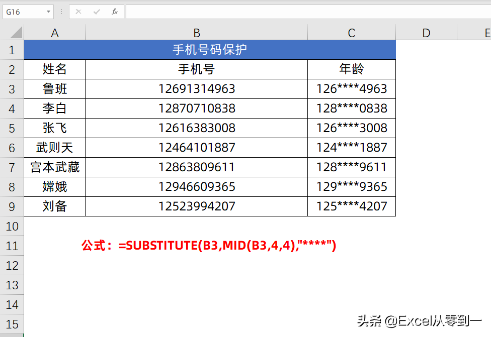 Subtitute这个函数的作用是将字符串的某一部分替换为另一部分,在这里我们利用mid函数将手机号码中的一部分数据提取数据,然后再替换为四个星号