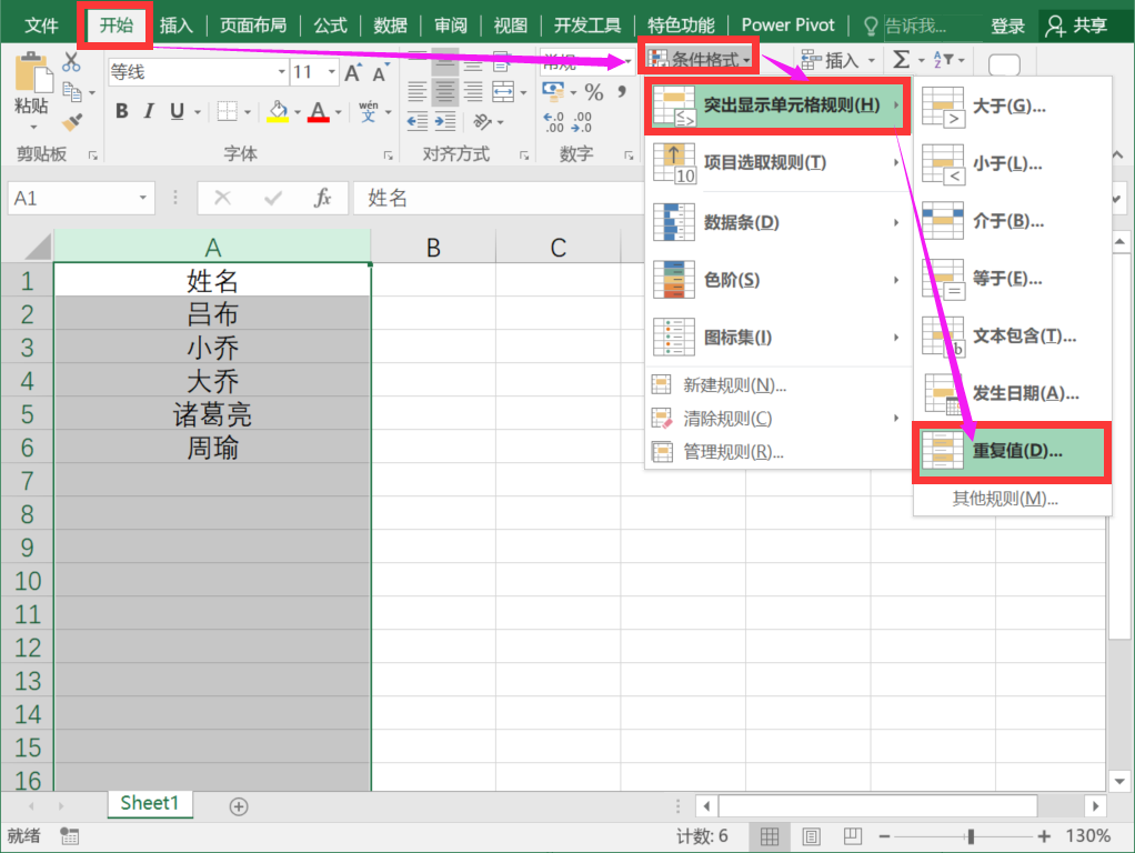 选择A列数据→点击开始菜单栏→点击条件格式→点击突出显示单元格规则→选择重复值