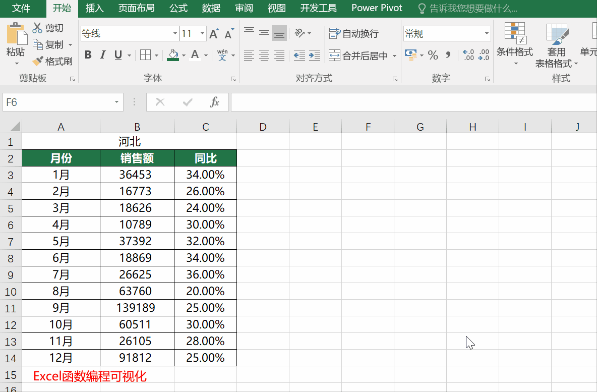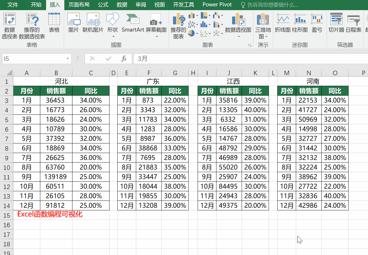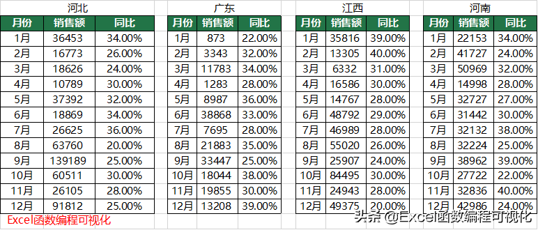 下图为部分数据源,现在我们需要将每个省份做一张图,一共有十几个省份,需要做十几张图,每张图除了数据不同之外,系列都是一样的,月份+销售额+同比。