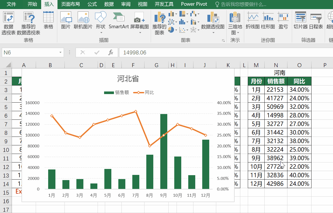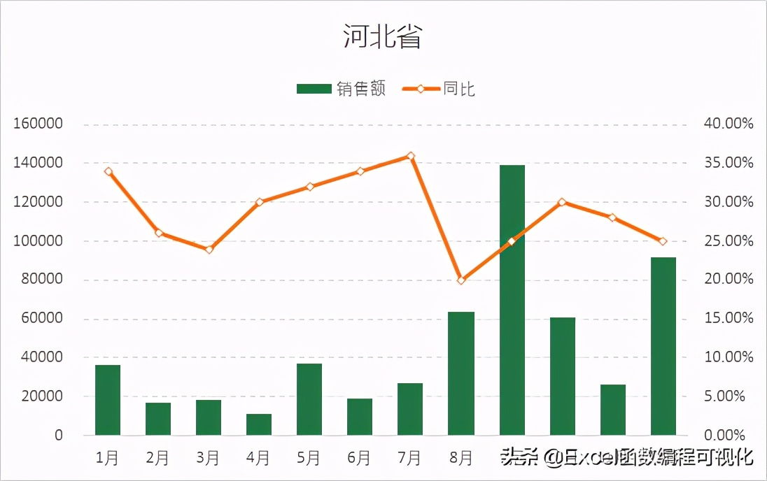 首先我们先制作一个省份的图表,这里采用组合图,销售额系列主坐标,同比系列次坐标,如下图所示: