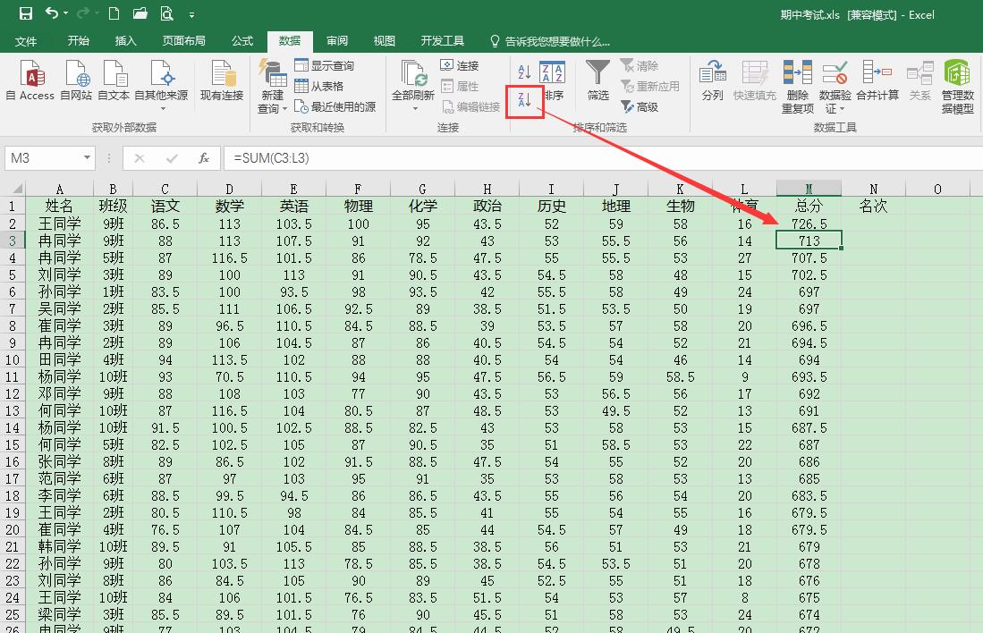 通过学生的测试成绩的总分对学生进行名次的排列,我们常用的方法是,先对总分进行降序排列。