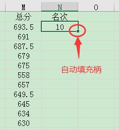 然后在名次列中填充名次数值,使用自动填充柄完成后面的数据的名次填充,完成名次的排列操作。