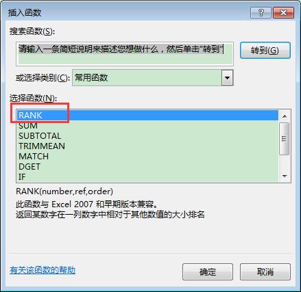 在"插入函数"窗口中,找到并单击选中"rank"函数,单击"确定"按钮。