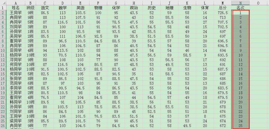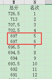 这种做法非常简单,但是有个弊端就是同一个分数会被填充成不同的名次,比如此表中,同样是697分,因为排列顺序的原因,名次分别是第5名和第6名。这种名次的排列显得不公平。在数据量大的表格中,这种不公平现象非常多。