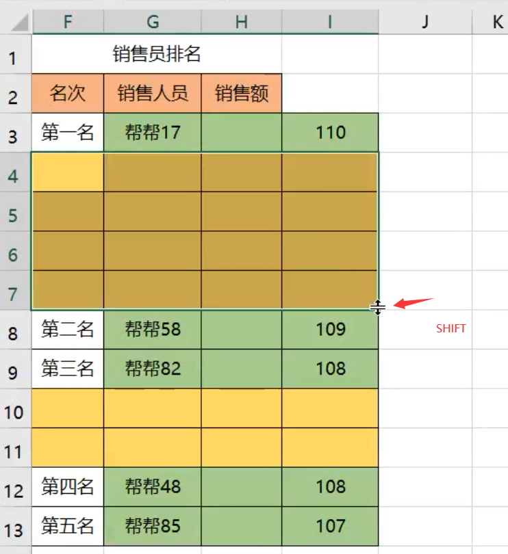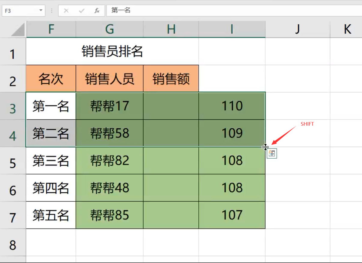 メ我们复习一下,框选表格区域到表格右下角,按住SHIFT键不动,鼠标变成图例形状。メ