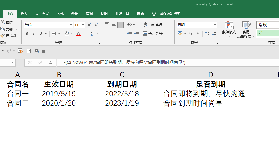 =IF(C2-NOW()<=90,"合同即将到期,尽快沟通","合同到期时间尚早")