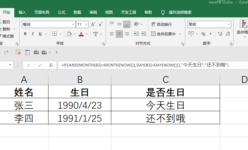 =IF(AND(MONTH(B2)=MONTH(NOW()),DAY(B2)=DAY(NOW())),"今天生日","还不到哦")