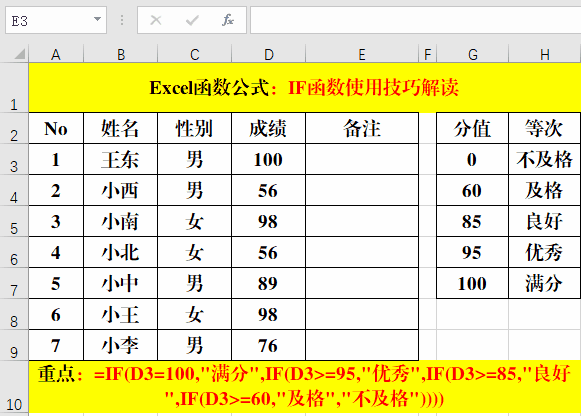 2、在判断时,必须按照“成绩”或“优良差”的顺序来书写公式,否则无法得到正确的结果。此示例中如果从低分向高分判断,则公式为:=IF(D3<60,"不及格",IF(D3<=85,"及格",IF(D3<=95,"良好",IF(D3<100,"优秀",IF(D3=100,"满分")))))。