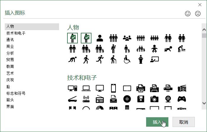 步骤02:打开【插入图标】对话框,在左侧选择图标类型,如选择【人物】选项,在右侧选择需要的图标,这里选中男性和女性人物图标对应的复选框,单击【插入】按钮,如下图所示。