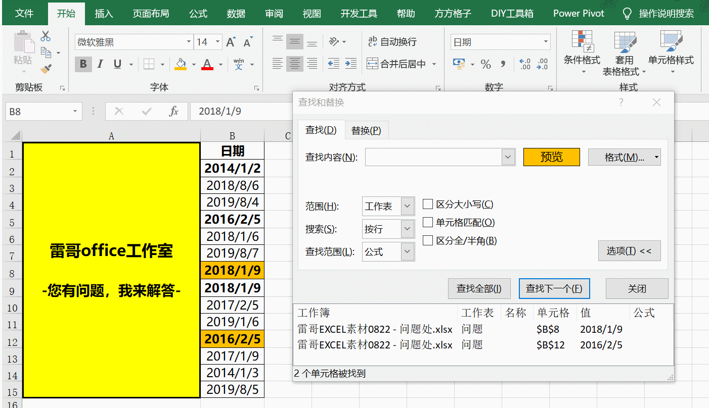 step1:选中「日期」列数据,按下快捷键「Ctrl+F」组合键弹出查找对话框 (或者单击“查找和选择”-查找工具);