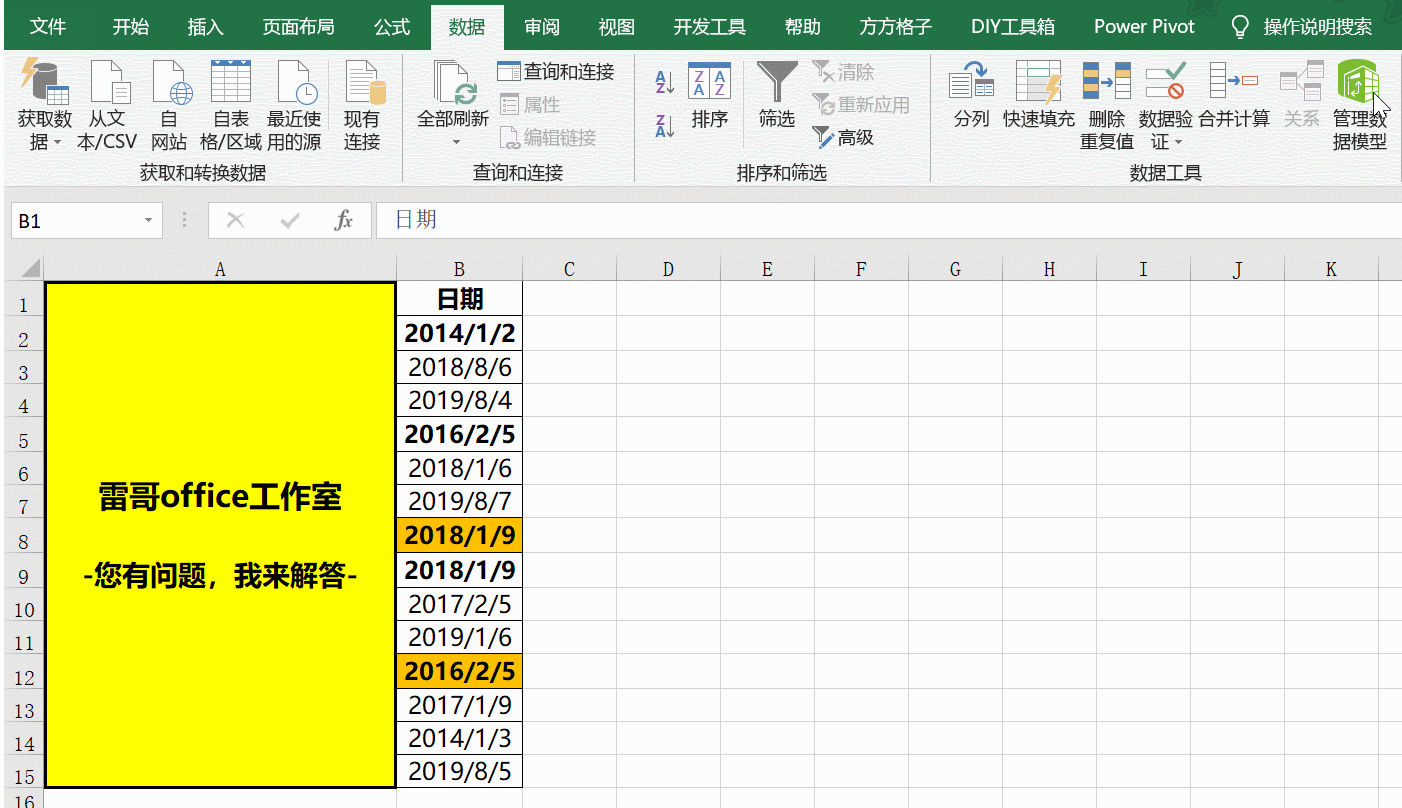 要求:快速删除橘黄色的重复日期;另外请思考,如何快速找出重复项?