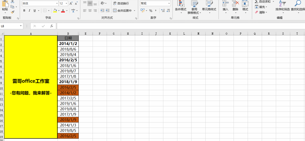 案例:下图B列日期中,橘黄色部分是我们已经标记好颜色的重复项。