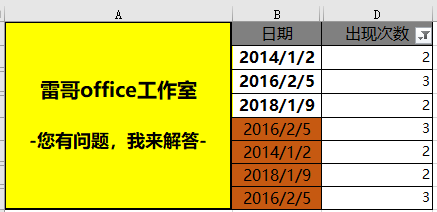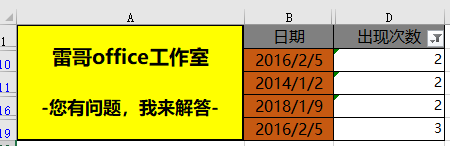 分析:D2单元格中,输入公式=COUNTIF(B:B,B2),并下拉该公式,可以快速统计出公式所在行的日期在所有区域中累计出现的次数。