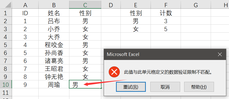 然后我们在C列如果不是输入男或女,则会弹出错误提醒,如下所示,是输入了一个空格之后再输入的男,就会出错。