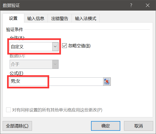 在数据验证中,设置自定义,公式使用男;女,注意中间的分号是英文状态下的分号