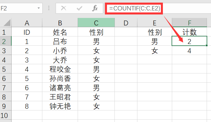 当我们使用计数函数,对男女进行计数的时候,你会发现:男生计数为2,女生计数为4,而我们肉眼看到,表格中男生数量是3个,女生数量是5个,这是为什么呢?